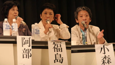 私の八月十五日「落合恵子さん、素敵な方でした」デモ・集会報告! ![]() (「市民文化フォーラム8・15集会」で話される落合恵子さんです。) 「きっこの日記 『2007/08/15 (水) 終戦日を詠んだ俳句』」 きっこさんが選んだ「終戦日の俳句 62句」を読んで このページを書き始めました。 一句、一句に思いを馳せながら読んで涙がこぼれました。 私の八月十五日は、ジローとゆきの散歩で始まりました。 この平和な日常を感謝すればするほど愛おしく 平和を育みたいと願い、思います。 家の用を少し手抜きをして昼間の一番暑い時刻に 家を出て神保町に向かいました。 ![]() ![]() 教育会館で行なわれた「市民文化フォーラム8・15集会」へ。 憲法学者の奥平康弘さん、医師で衆議院議員の 阿部知子さん、 弁護士で参議院議員の福島みずほさん、 憲法行脚の会・クレヨンハウス主宰の落合恵子さん、 九条の会で頑張られている東大教員小森陽一さん ![]() ところが、神保町に着くと機動隊、右翼の宣伝カーが元気一杯! 「こ?ら反天連のA野?出てこ?い」 名指しで大きな声がスピーカーから流れ毎年止めている 右翼の車が今年は走りまわっていました。 機動隊車は、前のガラスにネットかけ始めて ものものしい雰囲気になってきました。 皆さんのことが心配だったので暑い交差点で デモ隊を待つことにしました。 ネットをかけた機動隊の車が交差点の中へ斜めに止めて道路をふさぎました。 するとSさんの声でシュプレヒコールが聞こえてきました。 デモ隊を撮影したいけど何処から撮っても警察関係者や 右翼の皆さんの方が多い絵柄になってしまいました。 無事に交差点を通過したのを見届けて教育会館へ急ぎました。 ★「美しい国」の「美しい死者」はいらない --国家による「慰霊・追悼」に反対する8.15集会とデモ http://jp.youtube.com/watch?v=Vv888NYzvrs (videopressの動画) 集会はだいぶ進行していましたが、ラッキーなことに落合恵子さんの お話をしっかいりと伺うことができました。 個の大切さを日常の中から声をあげる自然体の落合さんの雰囲気が そのまま会場の中にとけ込み賛同の拍手が何度も聞かれました。 もちろん、私も叩いていました。 これから落合さんの生の言葉に接する機会を見つけるぞ!! そう、心に思った集会でした。 ![]() 会場には、「ガイサンシーとその姉妹たち」の映画を制作された 班忠義さんがお話をされました。 この映画は、10月27日(土)よりポレポレ東中野にて ロードショーが決まっています。 http://www.cine.co.jp/gaishanxi/ 8月17日(金)東京しごとセンター講堂にて 対談+上映会「夏のつどい」も開催されます。 上記のサイトでご覧下さい。 ![]() 集会の最後の挨拶は、針生一郎さんでした。 真面目なお話ぶりや表情が亡くなった父に似ているので何時も カメラを向けて何枚も写真を撮らせていただいています。 (07-08-16・おおきせいこ) お知らせ! ★ 「焼き場に立つ少年」 の写真家ジョー・オダネルさん(米国の写真家) が脳卒中のため10日に死去されました。85歳。 ★「NEWS for the People in Japan」 http://www.news-pj.net/ 市民のための(特に平和・憲法)情報を提供しているHPです。 お気に入りに書き込んでください。 |